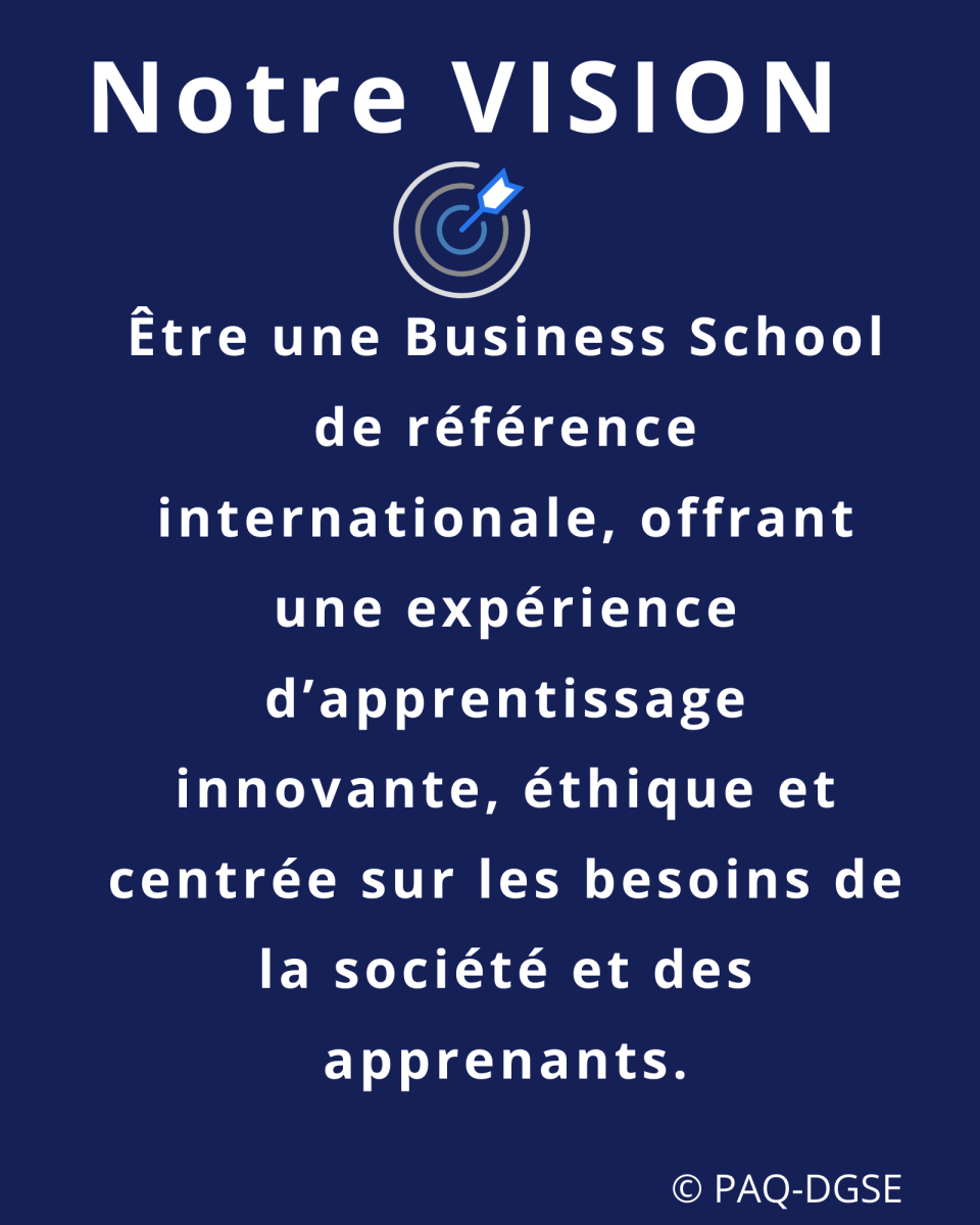 Être une Business School de référence internationale offrant une expérience d'apprentissage innovante, éthique et centrée sur les besoins de la société et des apprenants.